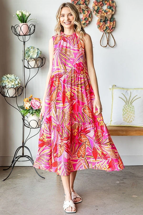 Features: Leaf Print, Tie Back, Sleeveless, Tiered, Midi, Dress