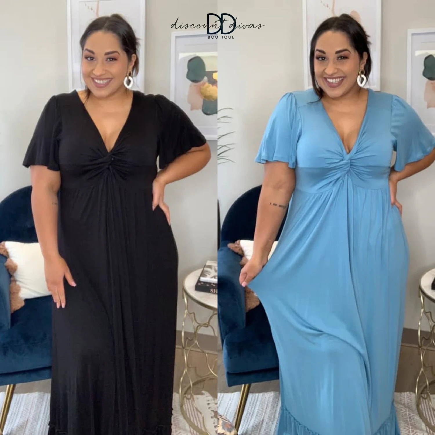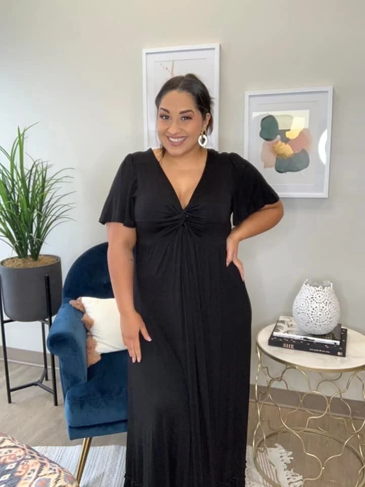 Features: maxi length, front knot, short sleeve