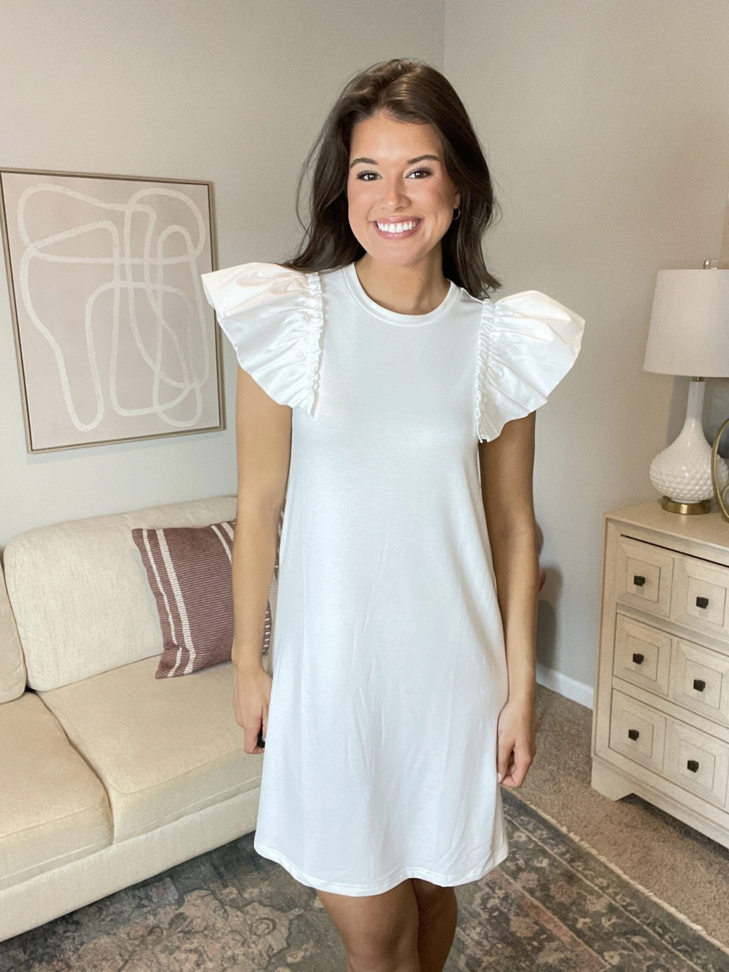 Features: solid print, round neck, short ruffle sleeves