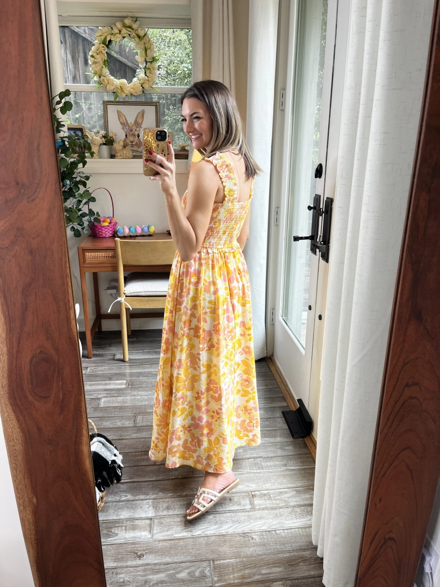 Features: floral print, smocked bodice, sleeveless, thick smocked straps, midi